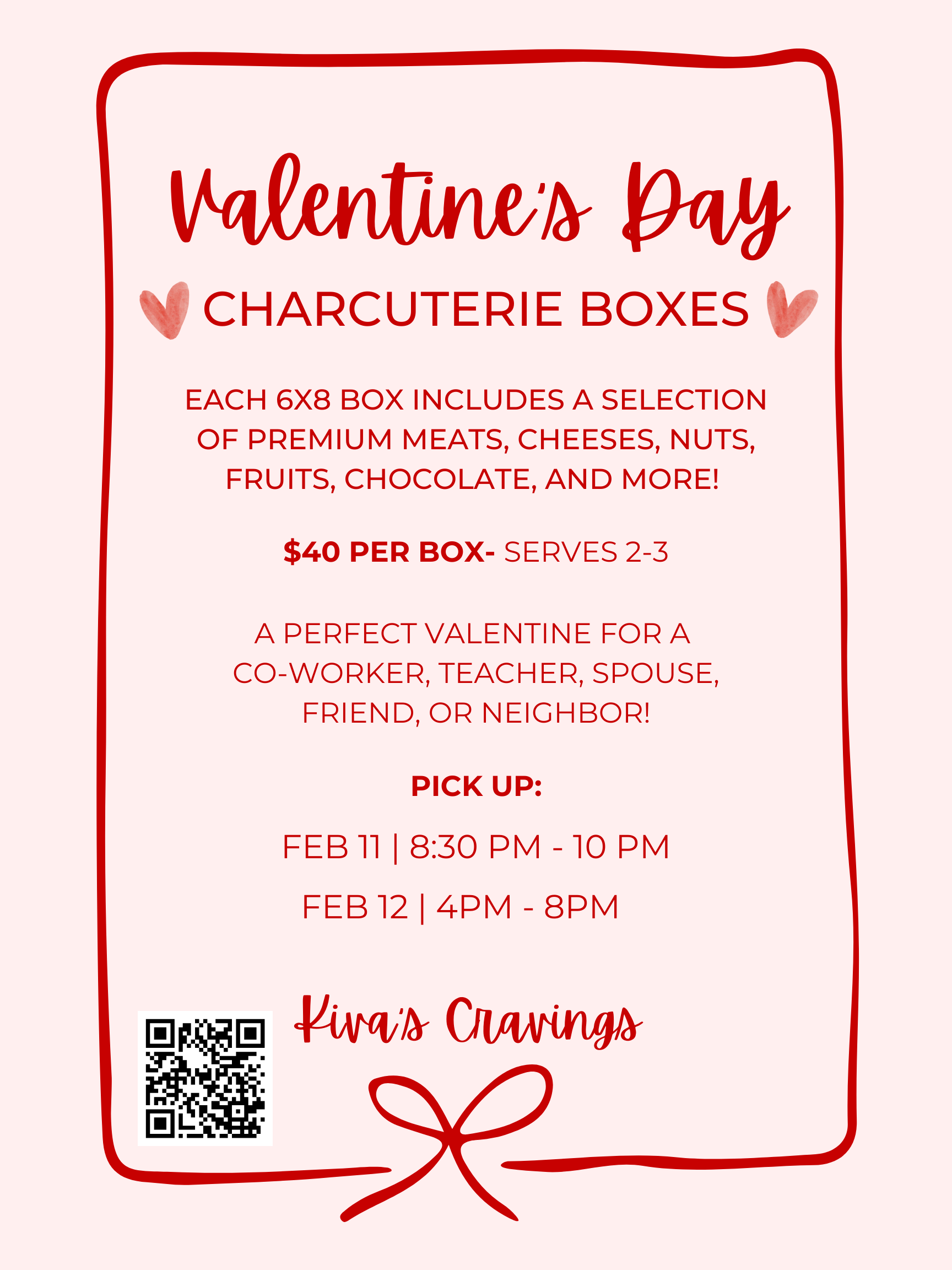Kiva’s Cravings provides kids baking classes, custom order baked goods, and charcuterie. I’d love to bake for you! Kids Baking Classes Custom Order Baked Goods Charcuterie Boards Seasonal Offers VALENTINES CHARCUTERIE BOXES! SCAN or CLICK QR code to order now! ORDER NOW